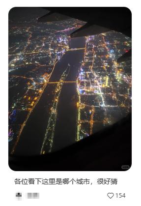 有人在飞机上拍下了夜晚的长沙,让网友猜是哪个城市。评论区湖南网友幽默回复," 首先排除长沙 "" 弗兰省纽哟市 "" 纽约市,右边那坨最亮的就是时代广场 "。