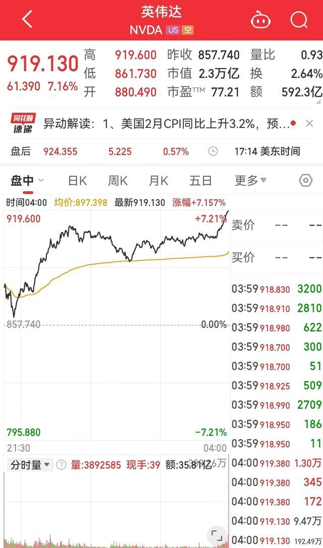 【环球网财经综合报道】美东时间3月12日,经历了两日连续下跌的英伟达股票强势反弹,收盘时涨幅超过7%,股价成功突破900美元大关。这一涨幅使得该公司在单日内的市值增加了超过1500亿美元,最新总市值达到了惊人的2.3万亿美元,一夜之间市值飙涨1.1万亿。