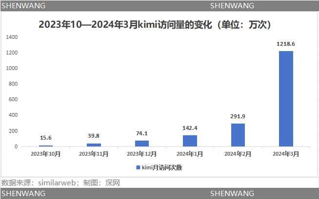 而3月19日至3月25日,在月之暗面宣布把长文本能力从20万字提升至200万字那一周,Kimi 的访问量达到了394万次,略高于文心一言的338万次,一度跃升为国内网页端周度访问量最高的AI应用。据similarweb数据显示,整个3月kimi的访问量达到1218.6万次。