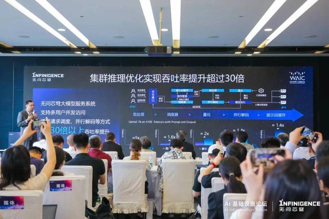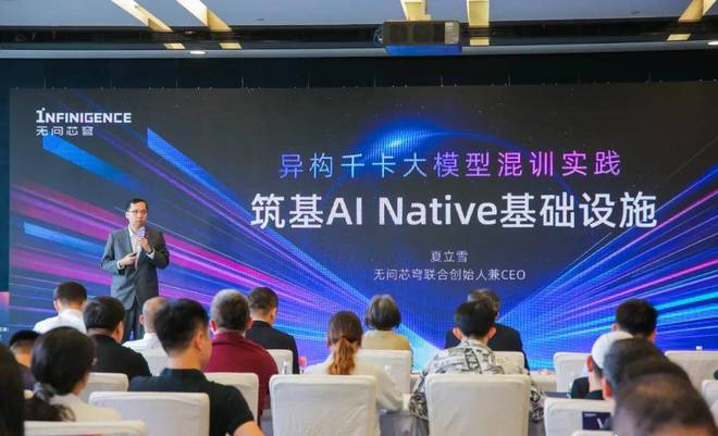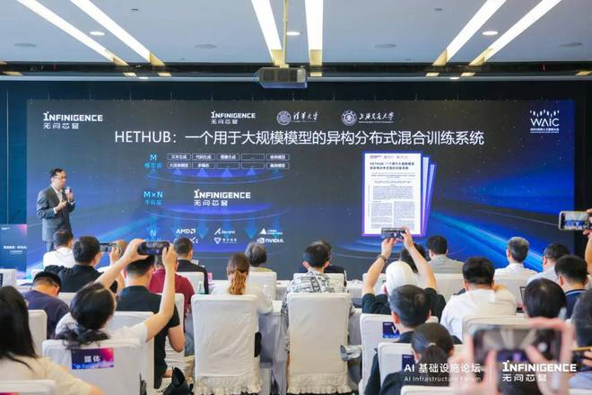 “有的模型不论配什么芯片,‘人设’都很稳定。有的模型换一个参数或换一种芯片搭配,就会表现出另一种行为模式。”无问芯穹的工作人员介绍,有现场观众为了探索这些组合背后的规律,把这款小游戏翻来覆去玩了半个小时。 “在Infini-AI上部署AI 应用的时候,就像在淘宝上购物时选择不同的尺寸、不同的颜色一样,可以把模型和芯片组合成一个套餐来使用。”夏立雪曾介绍,在Infini-AI上,想要什么样的模型与芯片组合,取决于开发者自己的选择,且使用时不会感受到底层硬件差异。 无问芯穹所构建的技术产品,打破了单一芯片品牌训练资源瓶颈,整合并扩大了市面上可用的算力范围。为AI开发者屏蔽了底层异构芯片的数量与性能差异,打通了多种模型到多种芯片间的高效训练与推理。并且,能让开发者们能够有效利用各类算力资源,摆脱算力不足焦虑,专注于AI应用创新。 千卡异构混训集群算力利用率行业领先 这一系列研、产进展背后,是无问芯穹研发团队在异构芯片计算优化与集群系统设计上的强大实力支撑。 近日,无问芯穹与清华、上交的联合研究团队发布了HETHUB,这是一个用于大规模模型的异构分布式混合训练系统,这是业内首次实现六种不同品牌芯片间的交叉混合训练,且工程化完成度高。已将高效的互联互通、精密的分布式并行策略,如张量并行、数据并行、通信overlap等封装入Infini-AI的训练产品中向开发者提供服务。