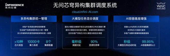 要有效利用这些算力,既需要多元异构芯片纳管和调度的能力,能灵活按需使用到算力资源,还需要在异构算力与算法框架之间架设一个中间层,统一用户编程框架到算力调用的接口,屏蔽硬件细节。同时中间层的设计能兼容现有用户的编程习惯,并支持对未来的扩展。 构建适应多模型与多芯片格局的AI Native基础设施,无问芯穹的底层解法是,提供高效整合异构算力资源的好用算力平台,以及支持软硬件联合优化与加速的中间件,让异构芯片真正转化为大算力。 从推理到训练,让开发者用上异构算力 为回应AI Native应用开发者的算力与工具需求,无问芯穹的Infini-AI云平台应运而生。Infini-AI云平台共由三部分构成,分别是异构云管平台、一站式AI平台(平台即服务,Platform as a Service)和大模型服务平台(模型即服务,Model as a Service)。