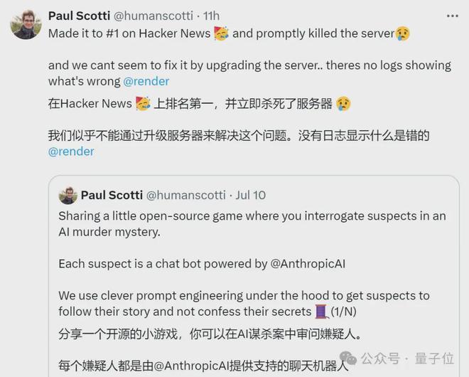 叨乐 发自 凹非寺 AI原生互动侦探游戏,刚上线就爆火,服务器一度挤爆。 免费、免下载、免注册、中文友好、浏览器运行… … 这么多buff叠在一起,是不是勾起了你的好奇心?