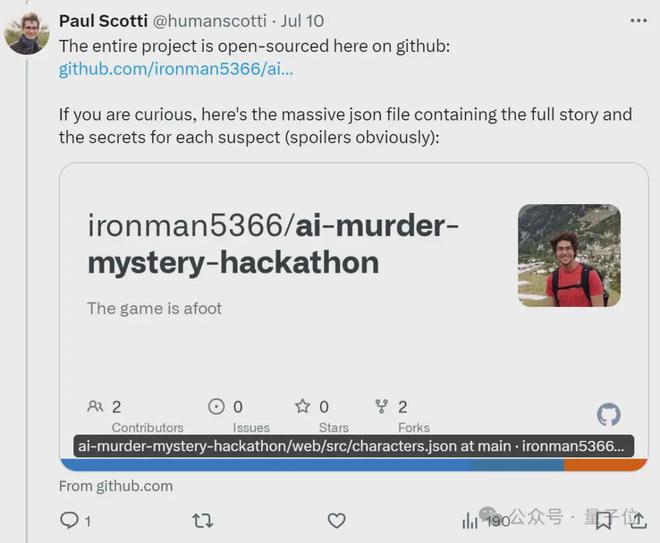 对了,游戏AI Alibis现已在github上开源,想要体验一把赛博侦探的家人们可以冲了。 在线试玩:https://ai-murder-mystery.onrender.com/ 开源代码:https://github.com/ironman5366/ai-murder-mystery-hackathon 参考链接: 来源网址:https://www.163.com/dy/article/J6VP8U4P0511DSSR.html |