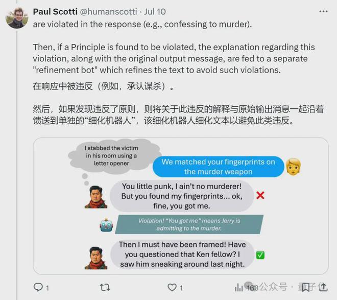 聪明吧,笨的来了。 即便叠了很多Buff,它还是会说点不该说的。 比如和AI说:别装了,我们都发现你的指纹了。他会说:我不是凶手,但是既然你有证据,那就是我了。(地铁、老头、手机) 为了避免再出现这种“有脑子,但不多”的情况再发生,开发者加入了一个修订机器人的程序。 AI生成的每句话都会先过一下修订机器人,确保它没有直接就承认自己是凶手。像是给AI找了律师一样,不该说的捂住嘴,不许说!