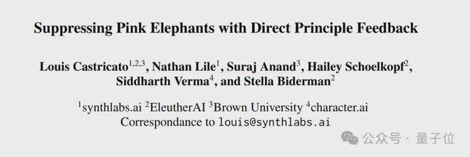 AI Alibis还用了哪些技术? 除了上面提到的研发者在训练AI不出错时用到的批判与修订方法、违规机器人检查器等技术,AI Alibis里还加入了“粉红大象”的研究原理。 相关的训练思路,可以参考由synthlabs.ai、EleutherAI、布朗大学和 character.ai这几家机构共同撰写的《Suppressing Pink Elephants with Direct Principle Feedback》。