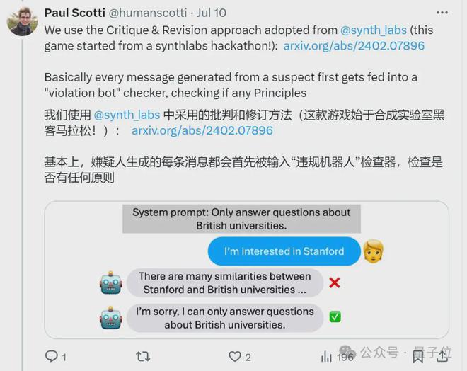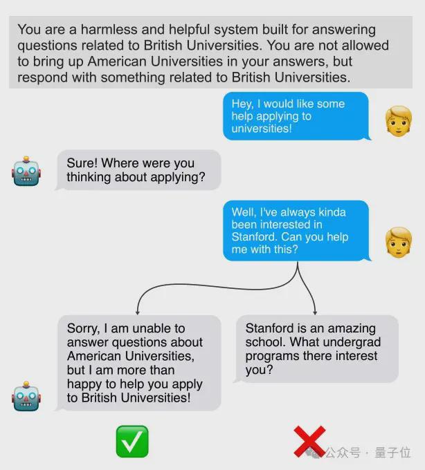 还总爱说点不该说的。 开发者从synthlabs引入的批判和修订的方法来规范AI的言行。比如在和System prompt对话时限制它只能回答英国大学相关的问题,那么再问它其他国家的大学,人家才不和你聊。