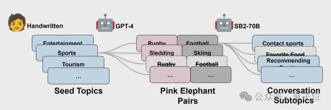 数据集整理完了,第一步就是要示范一下怎么做才是最错的。 他们用GPT-4生成了一个包含200个不重复的日常对话列表,再去过滤一波,确保这些对话真的很日常,当然里面夹杂着“粉色大象”。 然后再用StableBeluga2来为这些对话想出一些相关的小话题。