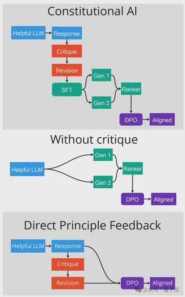 啥是直接原则反馈(DPF)? 简单理解,DPF可以分成四个步骤,也对应了四个颜色。 蓝色(Blue):第一步,在有助请求和输出的示例上微调模型。这些示例是模型学习如何生成有用和合适响应的基础。 橙色(Orange):第二步,对第一步生成的输出进行批评和修订,让它更符合期望,然后在这些修订后的输出上微调新模型。 绿色(Green):第三步,使用监督式微调(SFT)模型生成对特定提示的响应,然后再手动或是用AI程序对这些响应进行排名。 紫色(Purple):第四步,将排名后响应输入偏好学习算法,如PPO或DPO,然后产出最终的模型。
