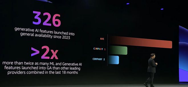 第二层,进一步完善中间工具层 Amazon Bedrock 以及各种附加功能。这一层,主要服务于对大模型有深度应用需求,但没有开发能力的企业。亚马逊云科技提供的除了全球主流大模型公司产品之外,同时提供各种微调、知识库、测试比较、安全等多种工具。仅过去一年半,亚马逊云科技针对不同需求,GA(正式可用)的数量有 326 个之多,是其他供应商总和的两倍。