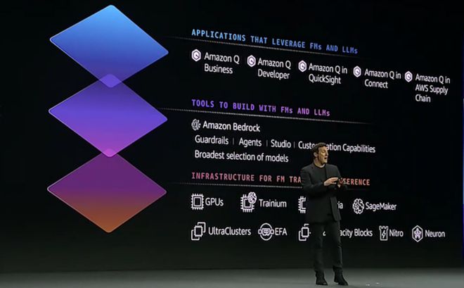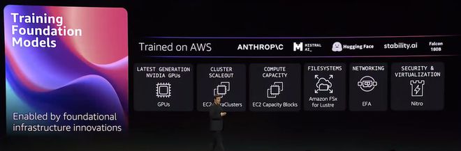 既然需求多元、技术评价多维,那亚马逊云科技的思路,就要打赢这场仗,需要的是一场「人民的战争」,尽量接入最多的大模型在平台之上供用户选择。目前,Amazon Bedrock,已经接入了三十多家世界顶流大模型。其中既包括亚马逊自研的基础模型 (Amazon Titan),也包括了 6 家 AI 公司的第三方模型(如 AI21 Labs、Anthropic、Stability AI 等)。 更多的模型接入之外,过去一年多时间里,Amazon Bedrock 还推出了一系列功能辅助模型微调与上线:如 RAG(检索增强生成)、模型微调和定制功能、开发工具 Agents、模型安全功能 Guardrails for Amazon Bedrock 等。 在此基础上,本次发布会上,针对开发工具 Agents for Amazon Bedrock,亚马逊云科技继续推出两大重磅新功能。 (1)保留交互记忆——用户与算法的每轮对话的摘要将被保留,进而在航班预定、点外卖等复杂多步骤任务中,能够自动为用户推荐满足其座位偏好、餐食选择偏好的决策。真正做到让大模型适应每个用户独特需求和偏好做到千人千面。 (2)代码解释功能上线——该功能可以在安全的沙盒环境中动态生成和运行代码片段,并能够处理复杂的用例,使得大模型能力提升到可以处理包括数据分析、数据可视化、文本处理、求解方程式和优化问题。 不过,无论是成为覆盖最广的大模型货架,还是提供最全的工具箱,都不是亚马逊云科技野心的全部。它的目标是成为整个时代的基础设施。 02 亚马逊云如何布局 生成式 AI 的三大关键层次 比单纯否定 MaaS 更难的,是建立新的技术与规范。 对亚马逊云科技来说,一个新的命题是,如果 MaaS 不成立,那亚马逊云科技又将如何应对来自不同客户的不同需求? 对外,亚马逊云科技选择将 AI 开发者生态做大。截止当前,亚马逊云科技已经在 200 个国家和地区培训了超过 3100 万名生态开发者,提前一年多实现了到 2025 年为全球 2900 万人提供免费云计算技能培训的目标。 对内,亚马逊云科技的答案则可以结合其在过去一年中在基础设施算力层、工具层、AI 应用层三大维度的不断拼图补全,可以窥见亚马逊云科技对整个市场的认知与针对性解法。